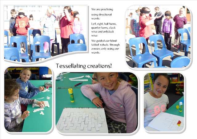 We've been learning about the attributes of 2 and 3D shapes (corners, faces, edges), reflecting, translating and rotating shapes, and using directional words - left, right, 1/4. 1/2 and 3/4 turns clockwise, anticlockwise.